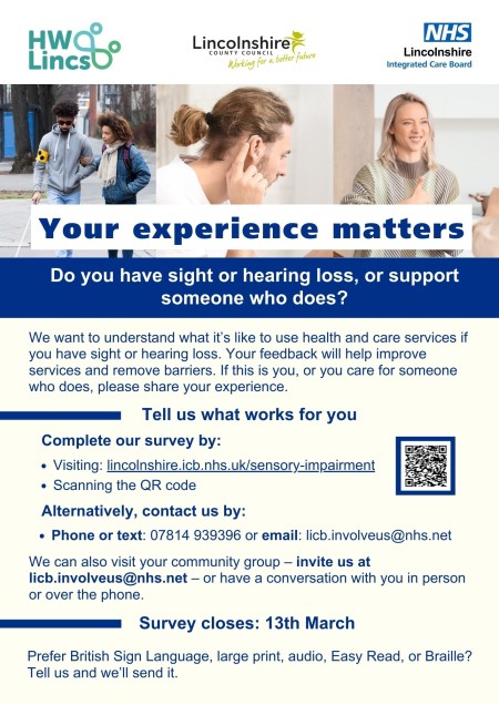 Lincolnshire Integrated Care Board (ICB) is inviting people to take part in this survey to help improve care and support for individuals affected by dementia. Your feedback will help us understand experiences, identify what is working well, and highlight where improvements are needed. By sharing your views, you will play an important role in shaping better, more responsive dementia services across Lincolnshire. Please scan the QR code or visit the website.