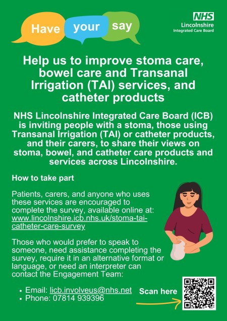 Lincolnshire Integrated Care Board (ICB) is inviting people who use stoma, Transanal Irrigation (TAI), or catheter products, as well as their carers, to take part in a survey. The survey aims to gather views and experiences to help improve the quality of care and support, and ensure the products provided best meet people’s needs. You can access the survey via the QR code or through the website.